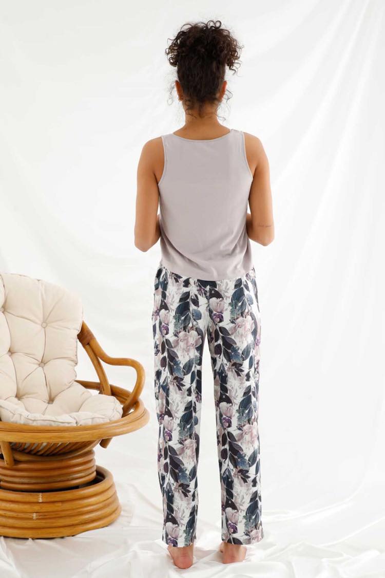 Дамска пижама в две части. Горната част е елегантен топ в синьо. Долната част е дълъг, свободен панталон с цветя . Моделът е слънчев, летен и много удобен за сън и почивка.